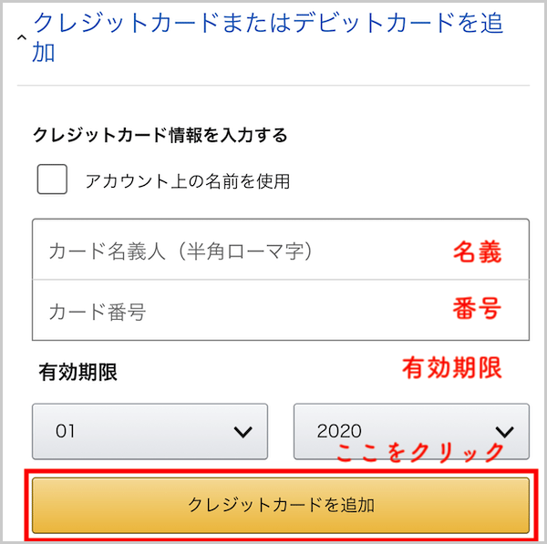 上記カードの場合は、カード番号名義有効期限を入力。請求先の住所も登録します。
